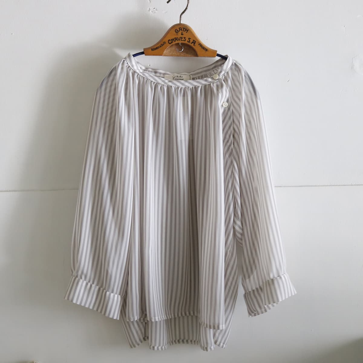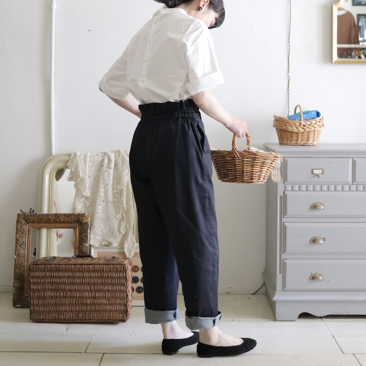 リネン生地のたっぷりギャザー、斜めに並ぶボタン.可愛らしさだけではないビンテージの雰囲気を感じていただけると思います.普段使いにデニムとカゴバッグ、スニーカーに合わせたい素敵なブラウスです...