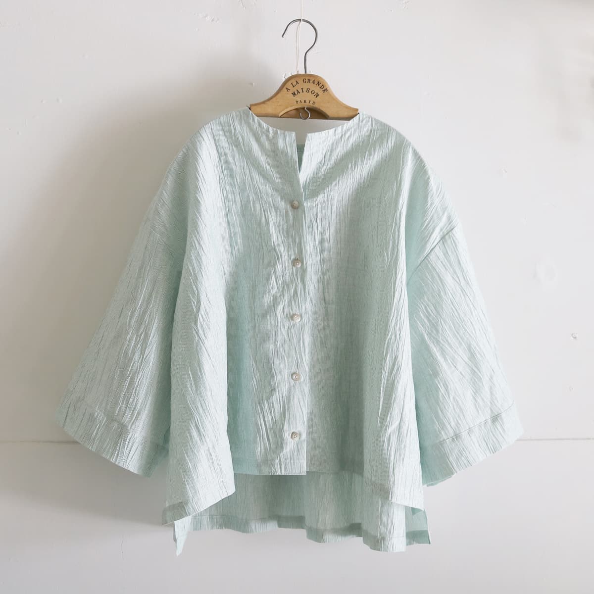 シュワシュワと心も軽く弾けるような、淡いソーダ色のグリーンのシャツです*後ろ下りのややハイネックになるノーカラーシャツです*丁寧にシワ加工を施した日本製の生地(リネンコットン)を使用しています...